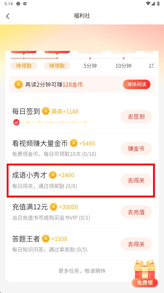 2、在福利社页面,找到成语小秀才板块,点击右侧的去闯关按钮。