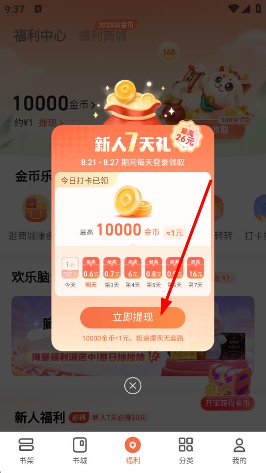 2、在福利中心,通过完成阅读任务、打卡签到等方式积累金币,当积累到一定数量 ,会弹出相关提现提示,点击立即提现按钮。
