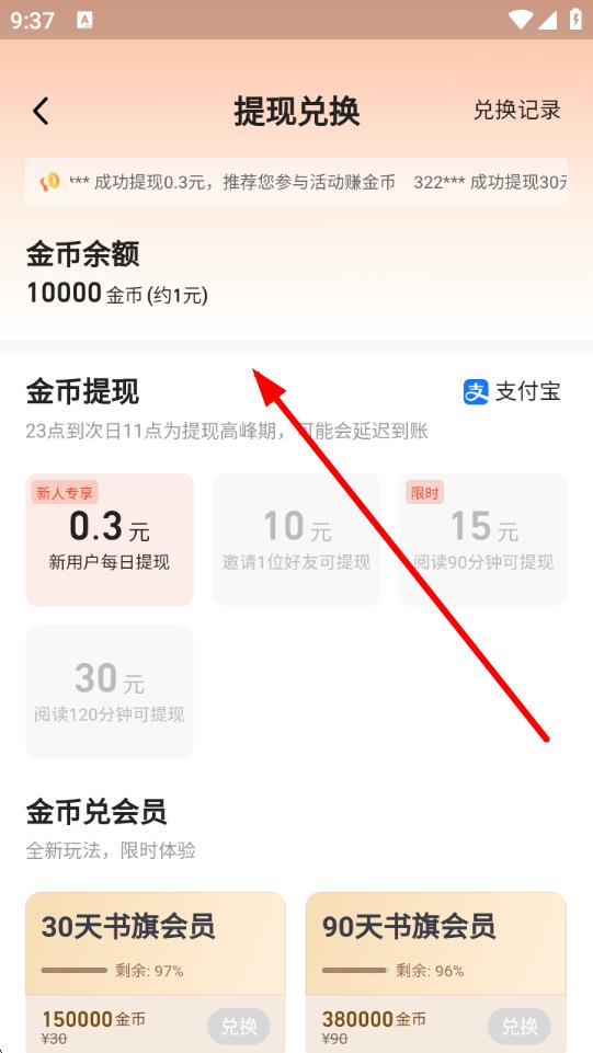 3、进入提现兑换页面后,查看金币余额,选择符合提现条件的金额选项,如新人专享的0.3元,按照提示操作完成提现,将金币兑换成现金转入绑定的支付账户。