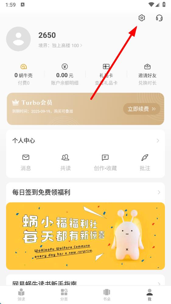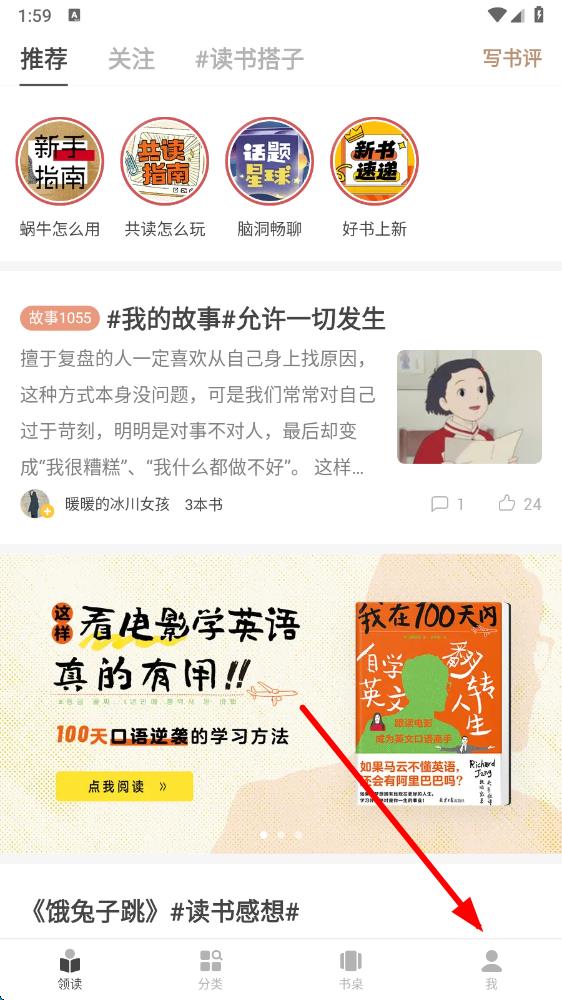 1、打开网易蜗牛读书app,点击底部导航栏中的我,进入个人页面。