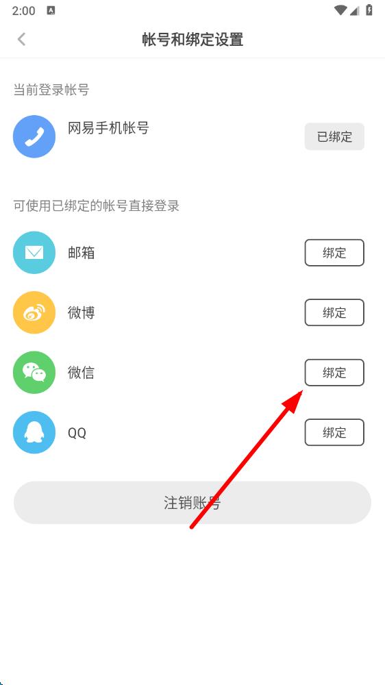 4、在帐号和绑定设置页面,找到微信一栏,点击其右侧的绑定按钮,按照后续提示完成微信绑定操作即可。