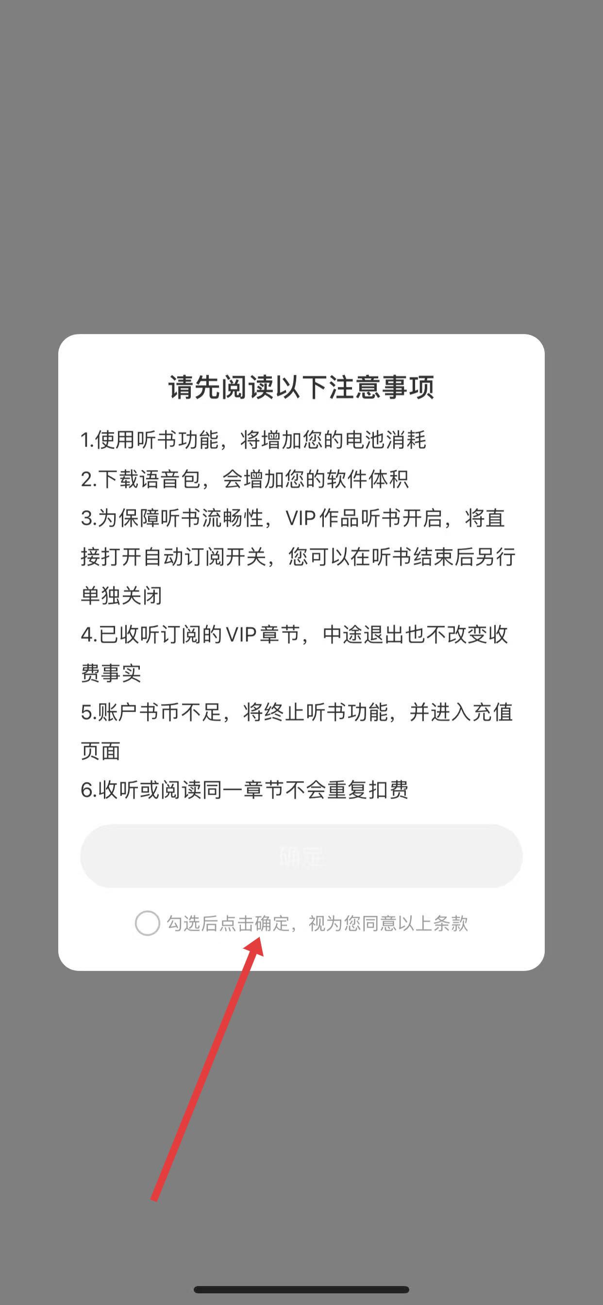 3、此时会弹出听书注意事项窗口,勾选勾选后点击确定,视为您同意以上条款。