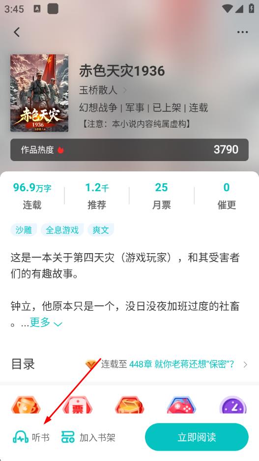 2、在小说详情页,点击左下角的听书按钮。