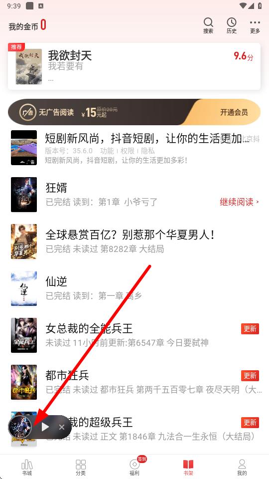 3、在书架页面找到想听读的书籍,若出现听书悬浮窗,点击悬浮窗也能快速进入听书,并按步骤2开启边听边读。
