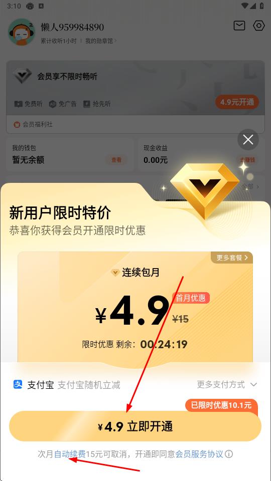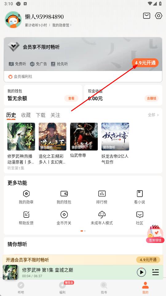 2、在个人中心页面,找到标注【4.9元开通】的会员开通入口按钮并点击,进入会员开通流程界面,此界面会呈现会员权益、价格及续费规则等关键信息。