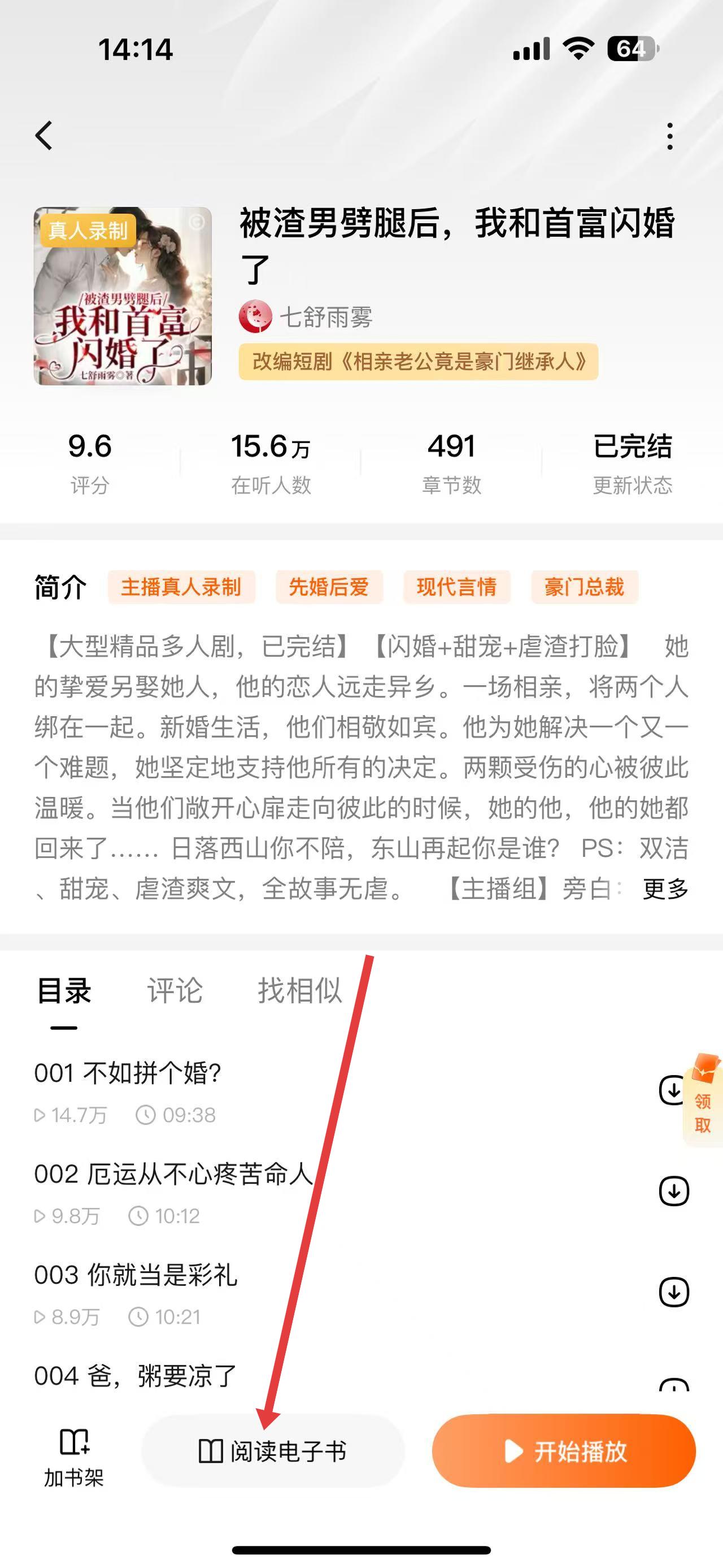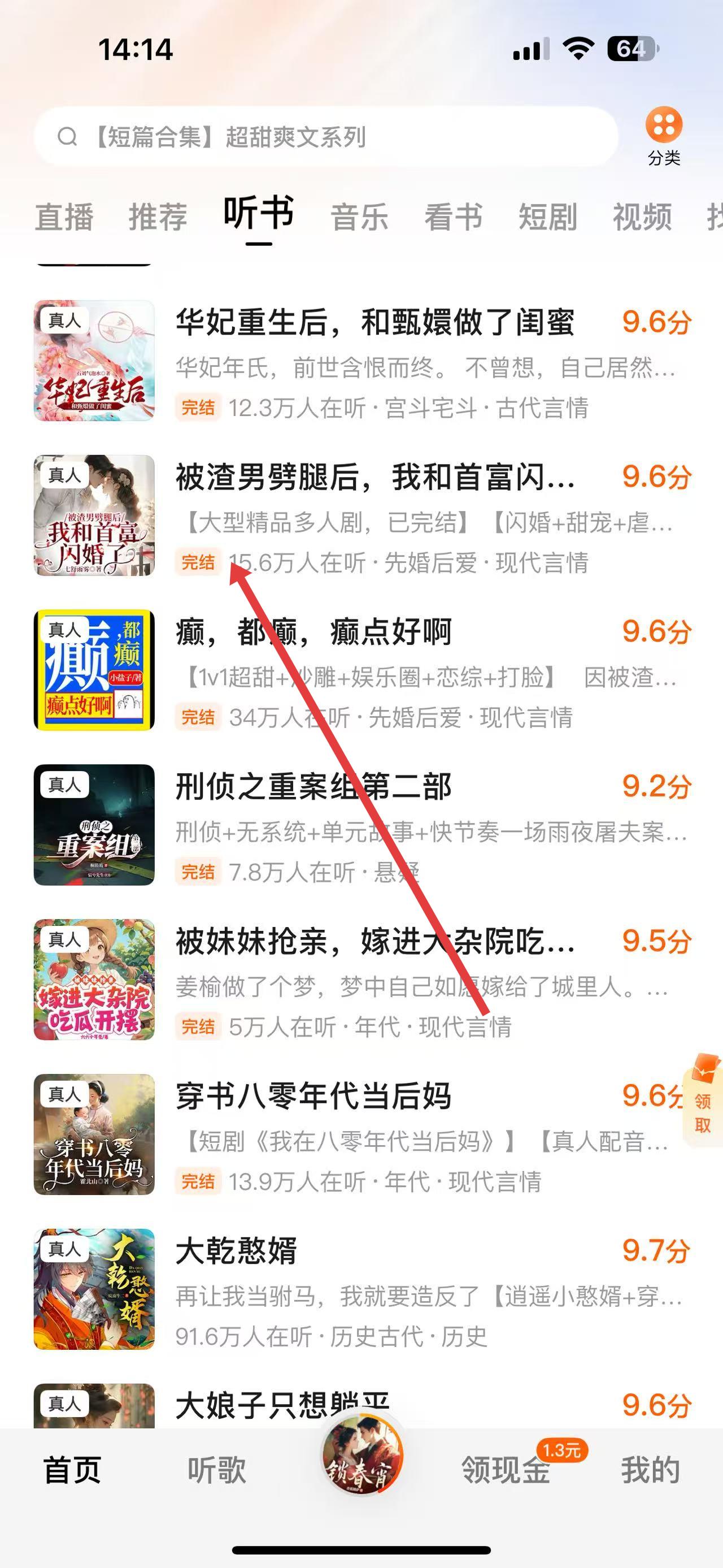 1、打开酷我畅听APP,点击下方导航栏中的听书,进入听书界面后,选择想阅读的书籍,比如被渣男劈腿后,我和首富闪婚了。