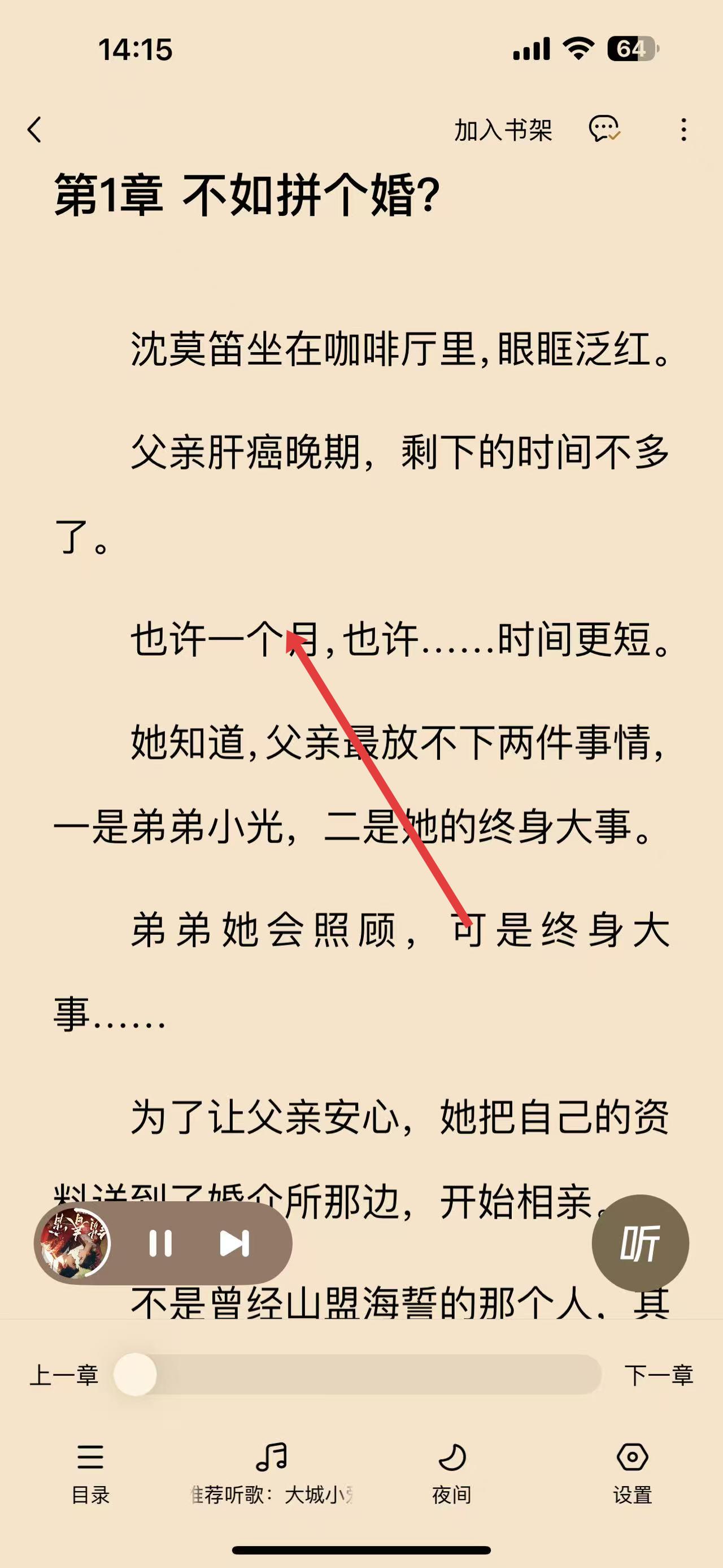 3、点击后就会进入书籍的文字阅读界面,你可以通过上下滑动屏幕来查看不同章节内容,还能使用底部的目录、设置等功能辅助阅读。