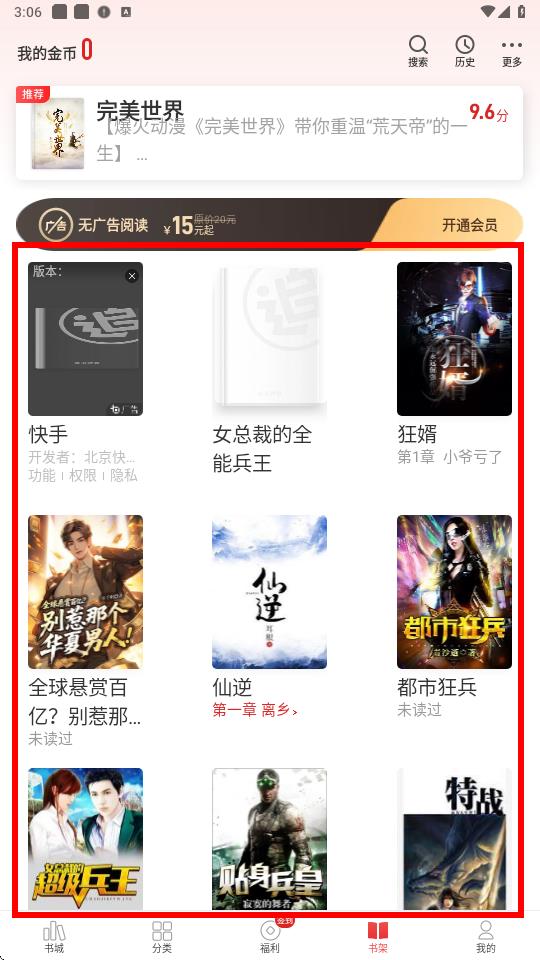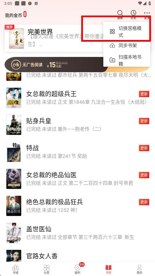 3、选择后,书架界面会切换为宫格模式展示书籍封面。