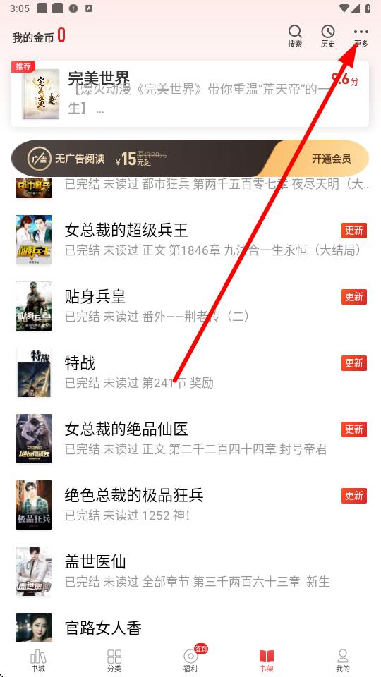 1、打开追书神器,进入书架页面,点击右上角更多按钮。