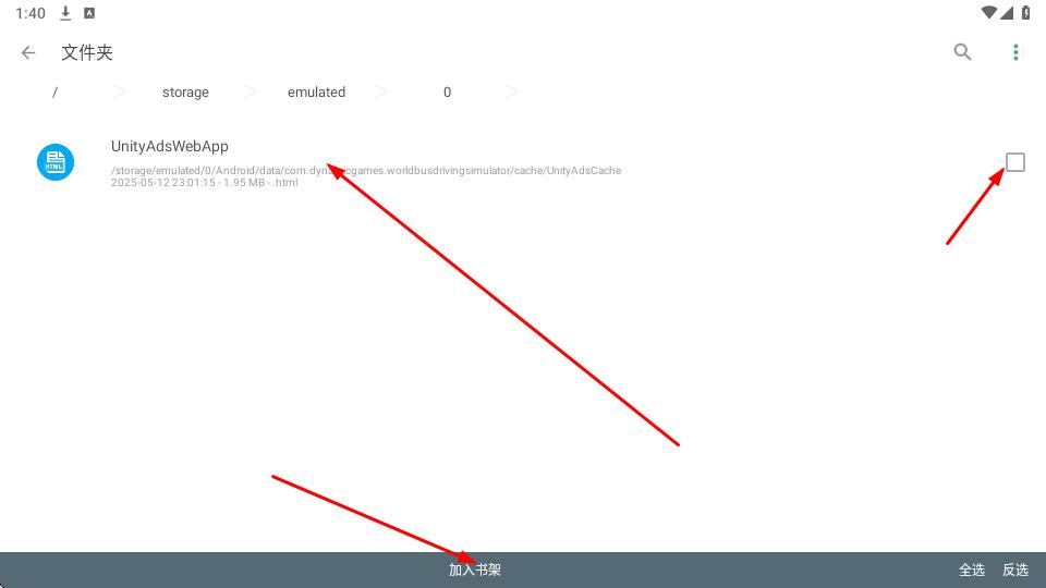 2、在文件夹界面,勾选目标文件UnityAdsWebApp右侧复选框,点击底部加入书架按钮。