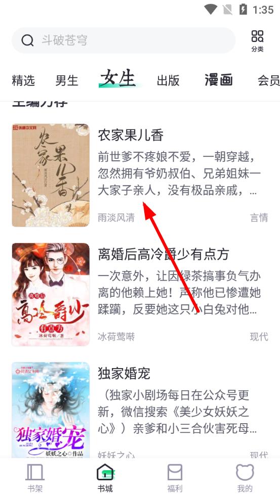 1、打开熊猫看书APP,点击底部导航栏的书城,在女生等分类里找到想操作的书籍,比如农家果儿香。