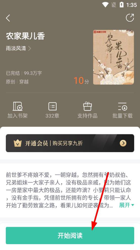 2、进入农家果儿香书籍详情页,点击开始阅读按钮,进入阅读界面。