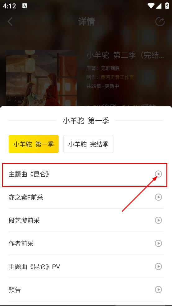 3、在剧集选择页面,点击主题曲右侧播放按钮,播放该主题曲。