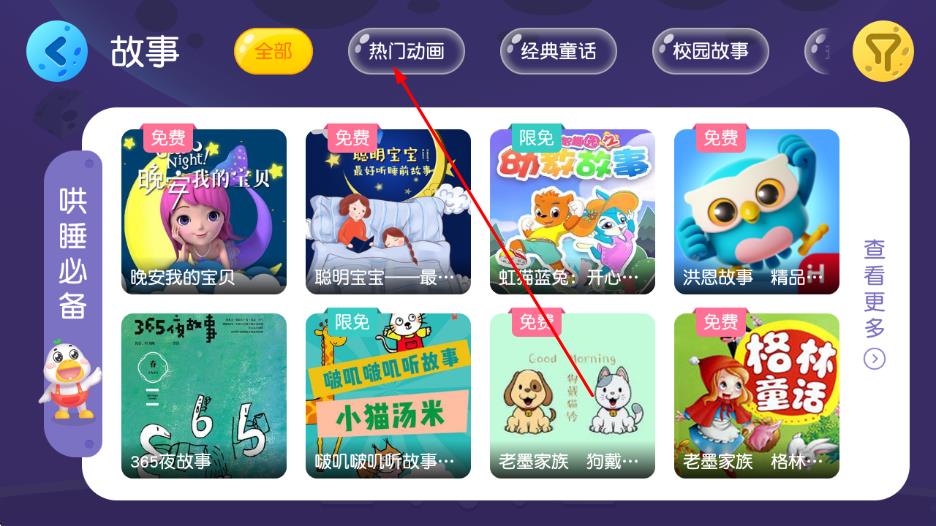 2、进入“故事”页面后,点击上方分类标签中的热门动画。