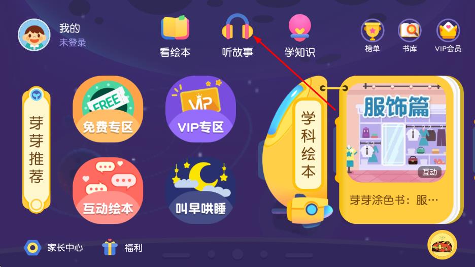 1、打开懒人听书儿童版App,点击主界面中的听故事选项。