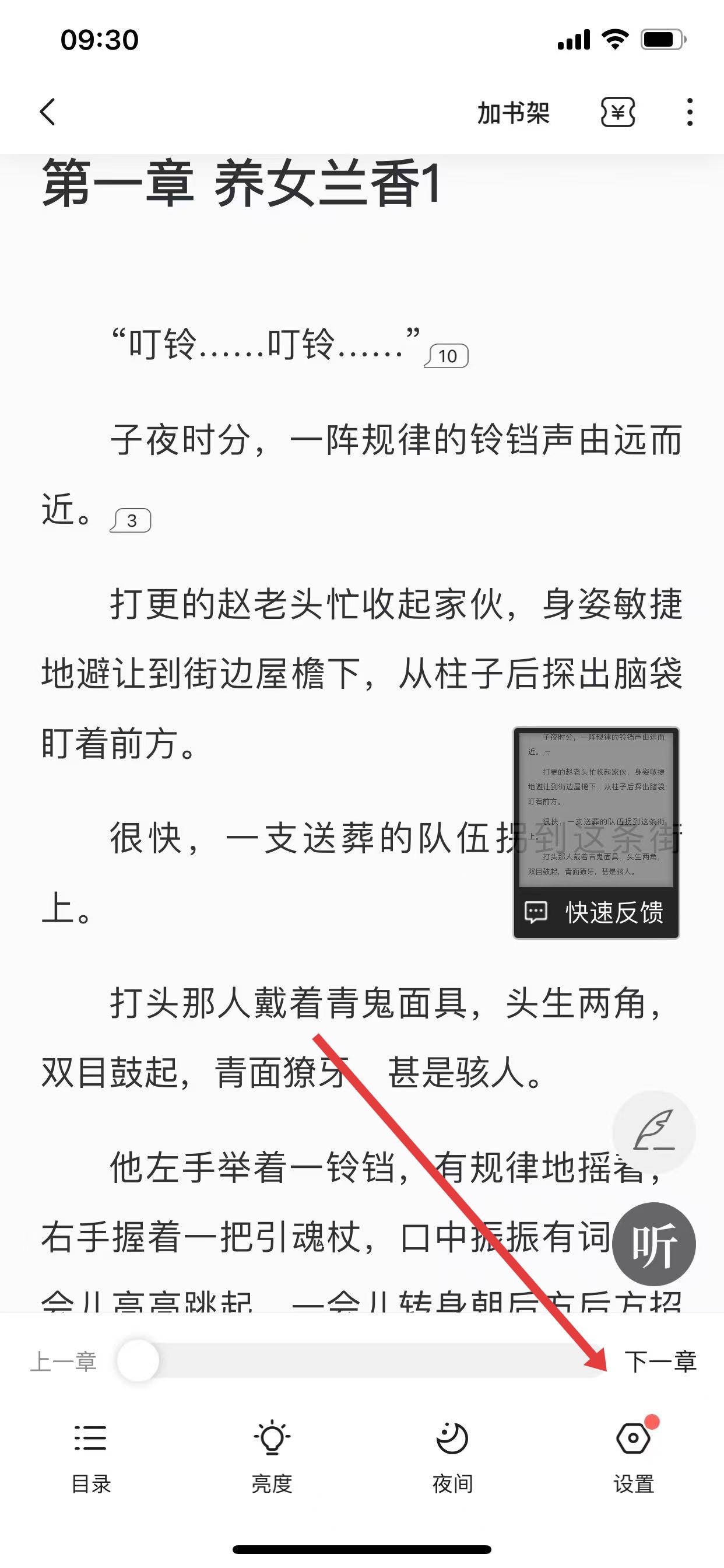 3、在阅读界面中,点击屏幕中间位置,唤出底部功能栏,点击设置图标。
