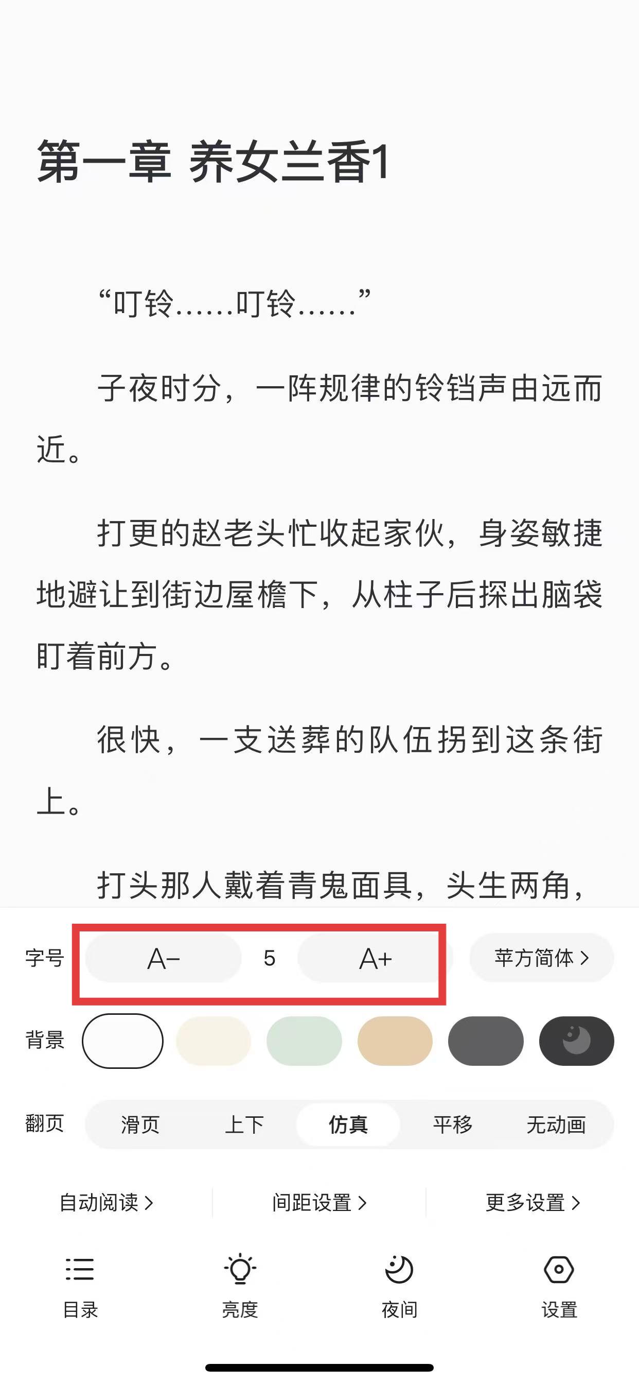 4、在设置菜单中,找到字号选项,点击A-可以缩小字体,点击A+可以放大字体,中间数字代表当前字号。