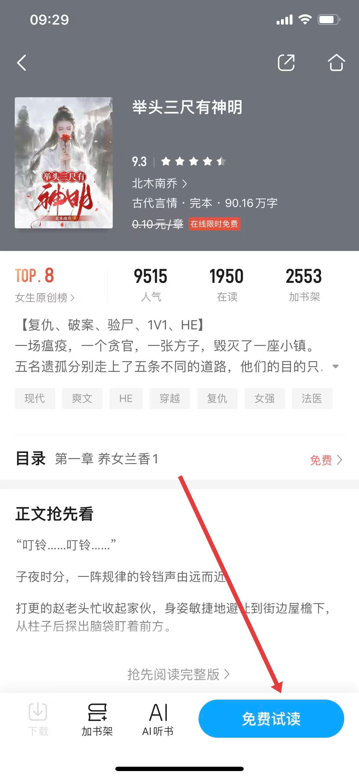 2、进入小说详情页后,点击免费试读按钮,进入阅读界面。