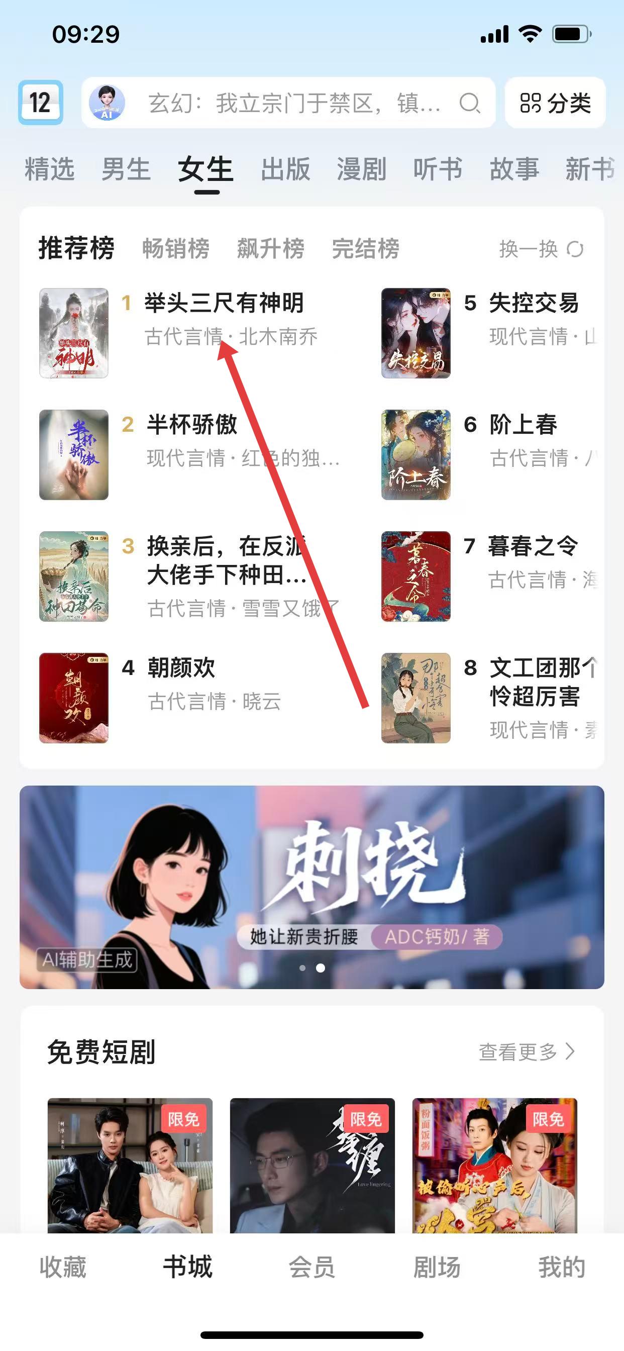1、打开咪咕阅读应用,在书城界面中,选择一本想阅读的小说。