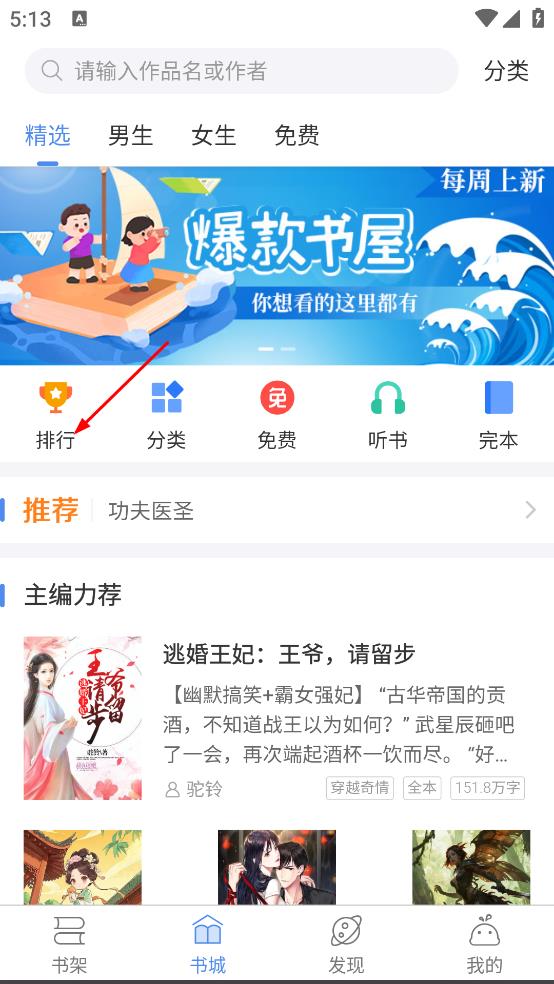 1、进入首页,在书城页面,点击排行,进入排行榜页面。