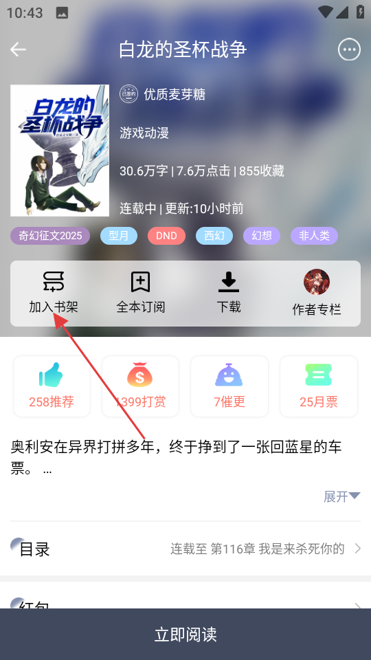 4、进入作品详情页后,点击加入书架按钮,将作品加入书架。