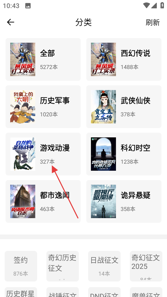 2、在分类页面,选择游戏动漫分类,进入该分类下的作品列表。