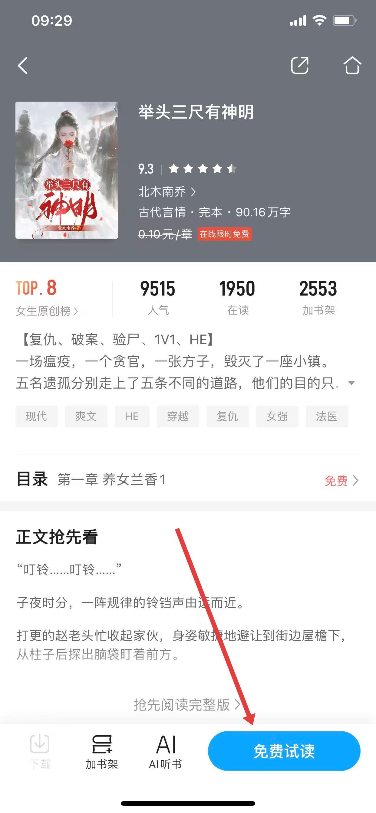 2、进入书籍详情页后,点击免费试读按钮,进入阅读界面。