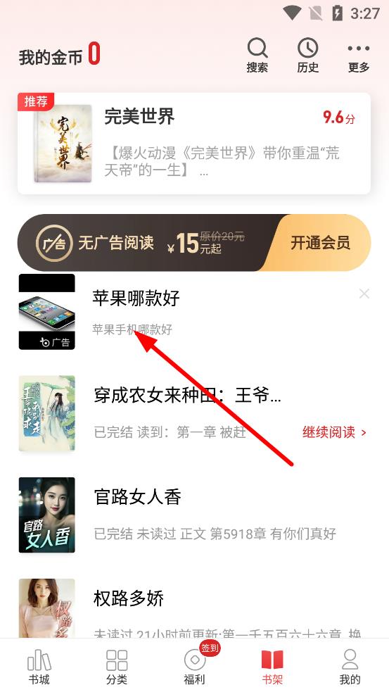1、在书架中找到广告内容,长按广告条目,会弹出操作选项框。