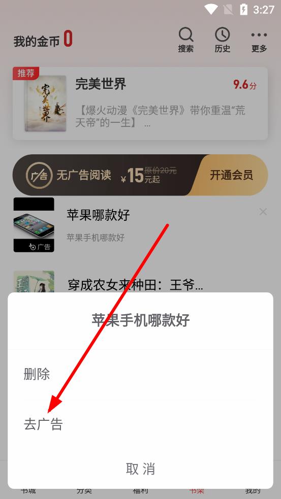 2、在弹出的选项框里,点击去广告选项。