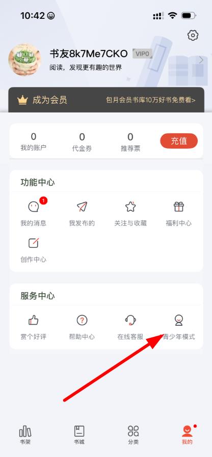 2、在个人中心页面的服务中心板块里,点击青少年模式选项,进入青少年模式设置界面。