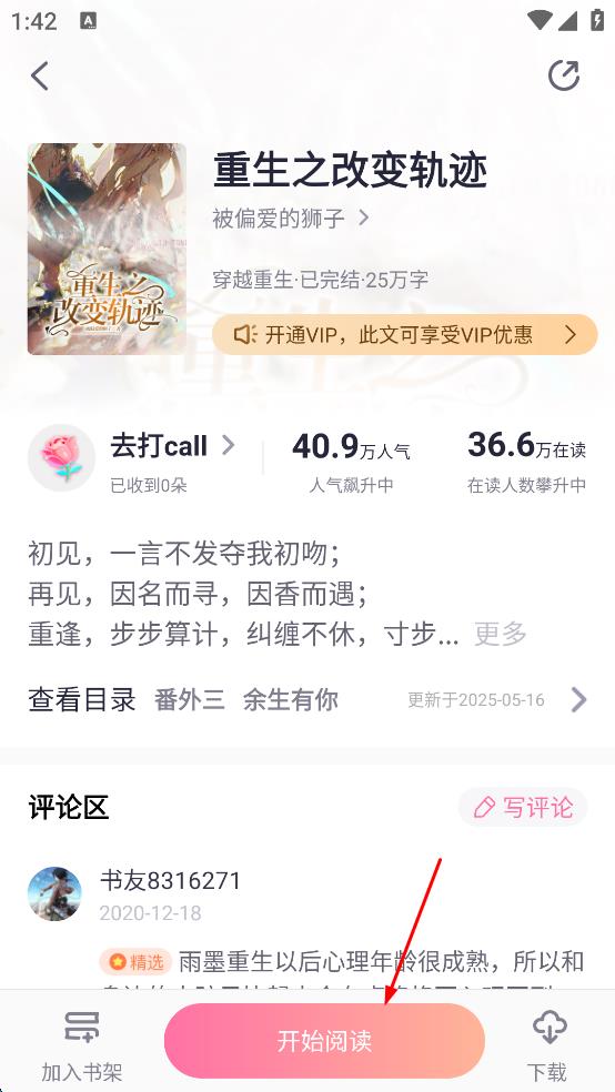 4、点击小说后,进入小说详情界面,界面展示了小说人气、在读人数等信息,还有“开始阅读”按钮,点击“开始阅读”按钮,即可开始阅读小说内容。