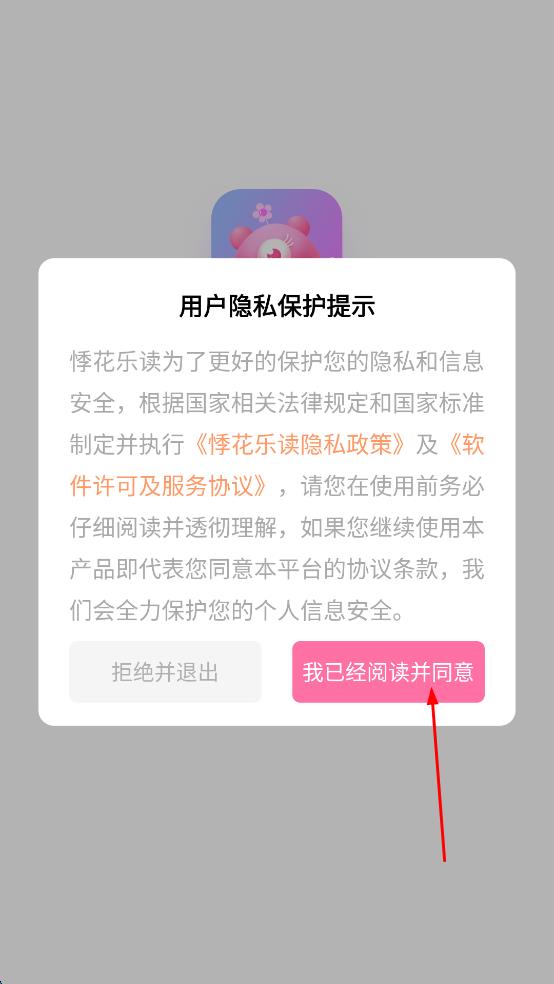 1、打开悸花乐读,进入用户隐私保护提示界面,界面说明会执行悸花乐读隐私政策及软件许可及服务协议,点击“我已经阅读并同意”按钮。