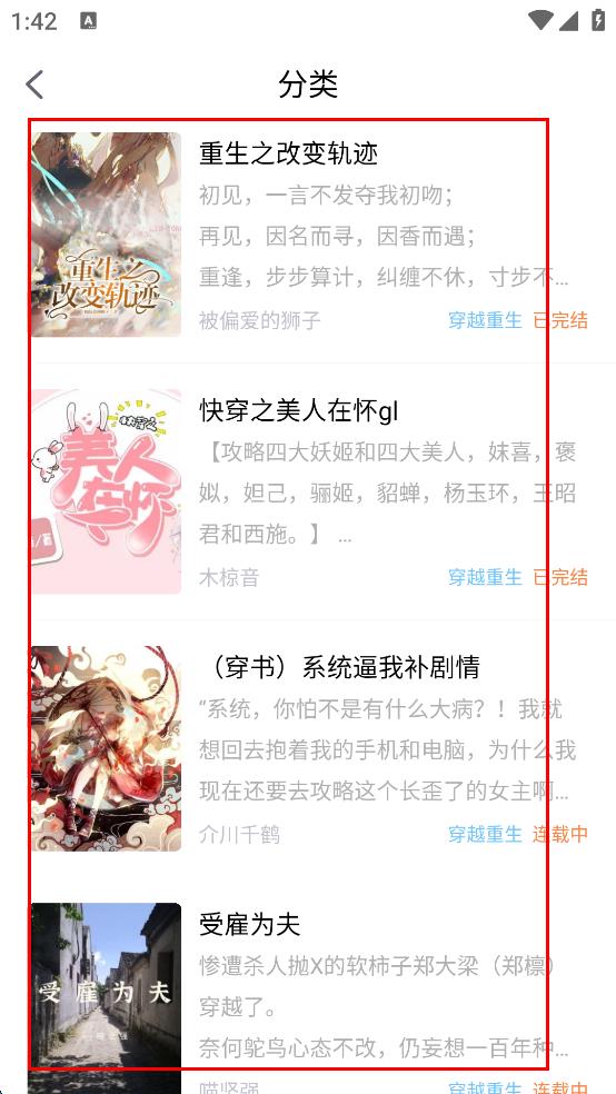3、在分类页面选择感兴趣的小说分类,进入该分类下的小说列表页面,列表展示了多部相关小说,找到想要阅读的小说,点击该小说。