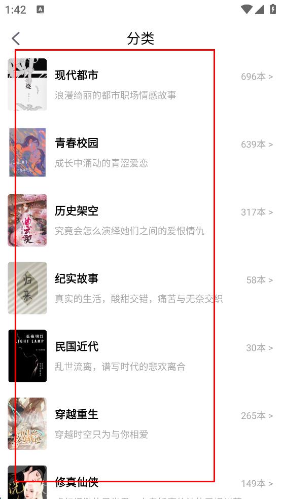 2、进入悸花乐读主界面,界面有小说分类板块,点击进入分类页面,可看到“现代都市”“青春校园”等不同小说分类。