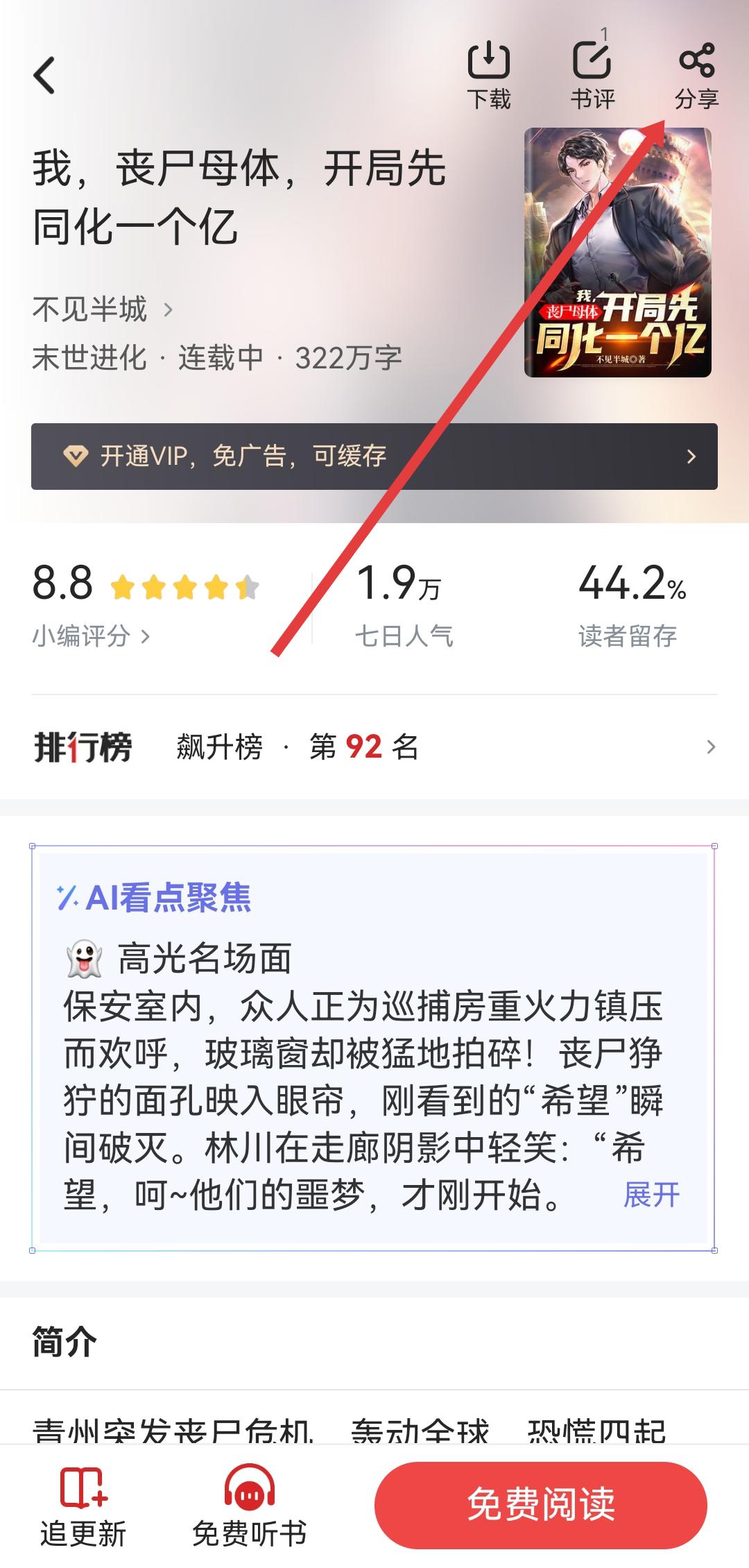 2、在书籍详情页面,点击右上角的分享图标,弹出分享选项列表。