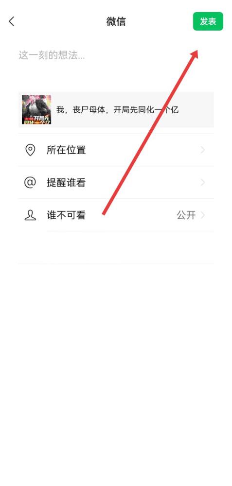 4、在微信朋友圈分享界面,然后点击右上角发表按钮,即可将书籍分享到朋友圈。