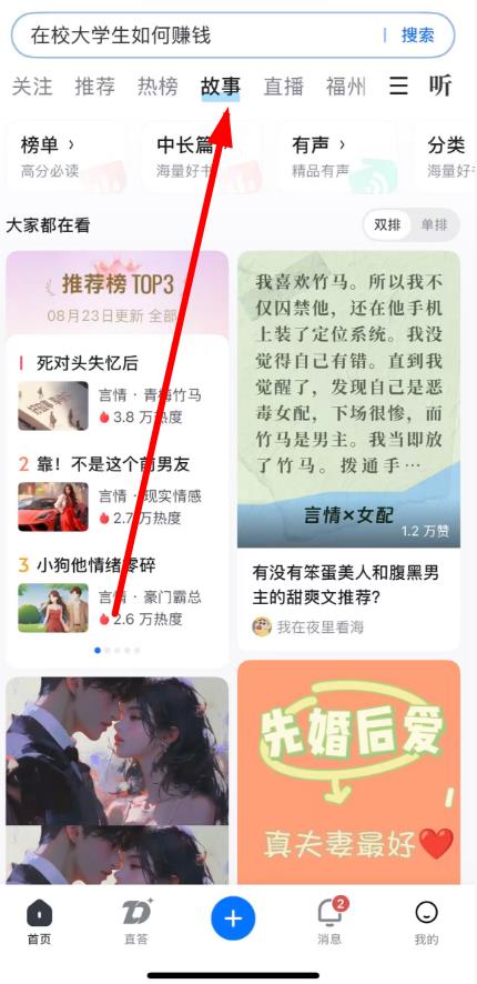 2、在首页上方导航栏找到并点击故事选项。