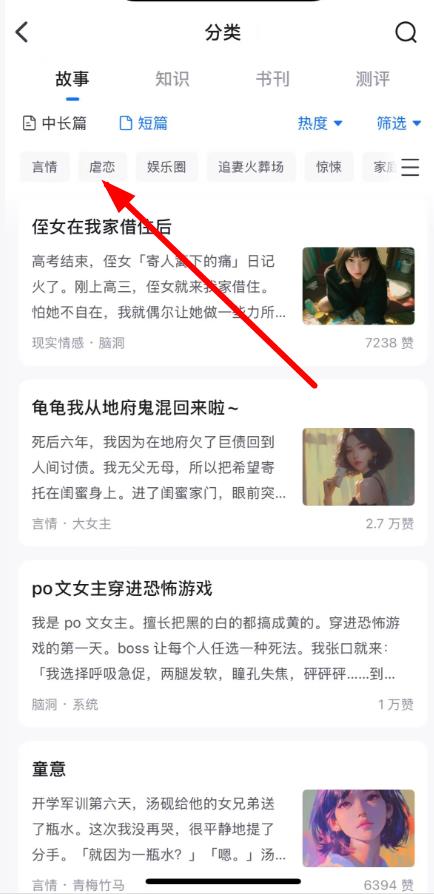 3、进入故事页面后,点击分类筛选,选择如虐恋等小说类别,浏览并选择感兴趣的小说阅读。