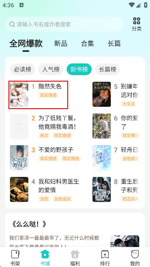 2、在新书榜单中,点击想要阅读的小说,如黯然失色。