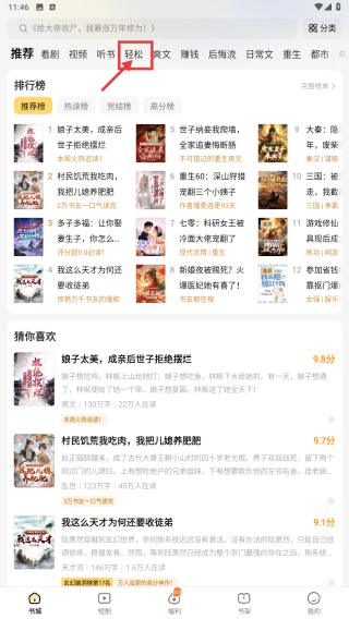 1、打开小说阅读类应用,点击顶部轻松分类标签,进入轻松类小说列表页。