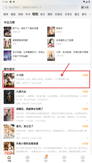 2、在轻松类小说列表里,选择小刁民评分为9.6分,点击进入小说阅读页面。