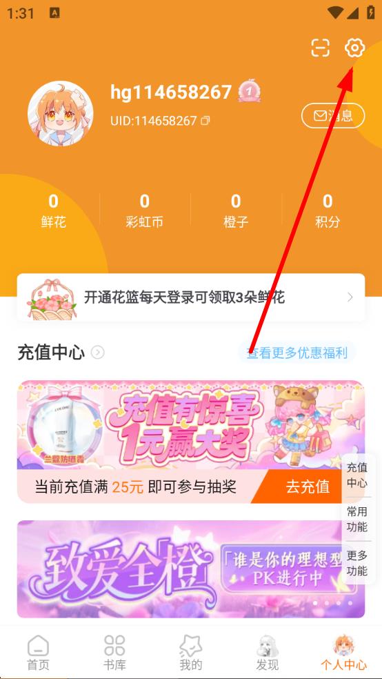1、进入个人中心页面,点击右上角齿轮状的设置图标,进入设置界面。