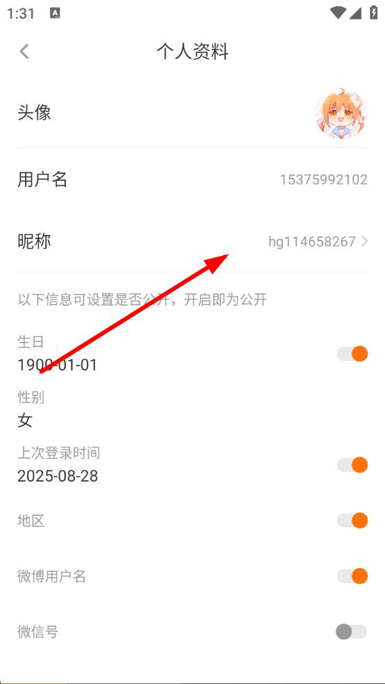 3、在个人资料页面里,点击昵称右侧箭头,即可修改昵称信息。