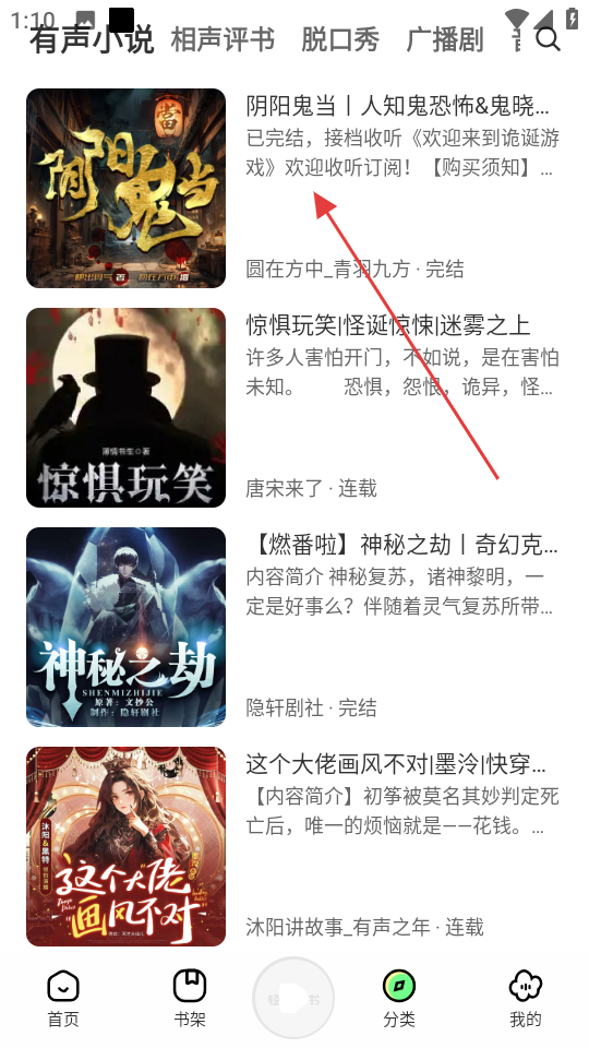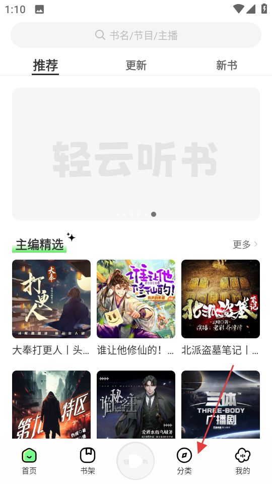 1、在听书类应用首页,点击底部分类,进入分类页面。