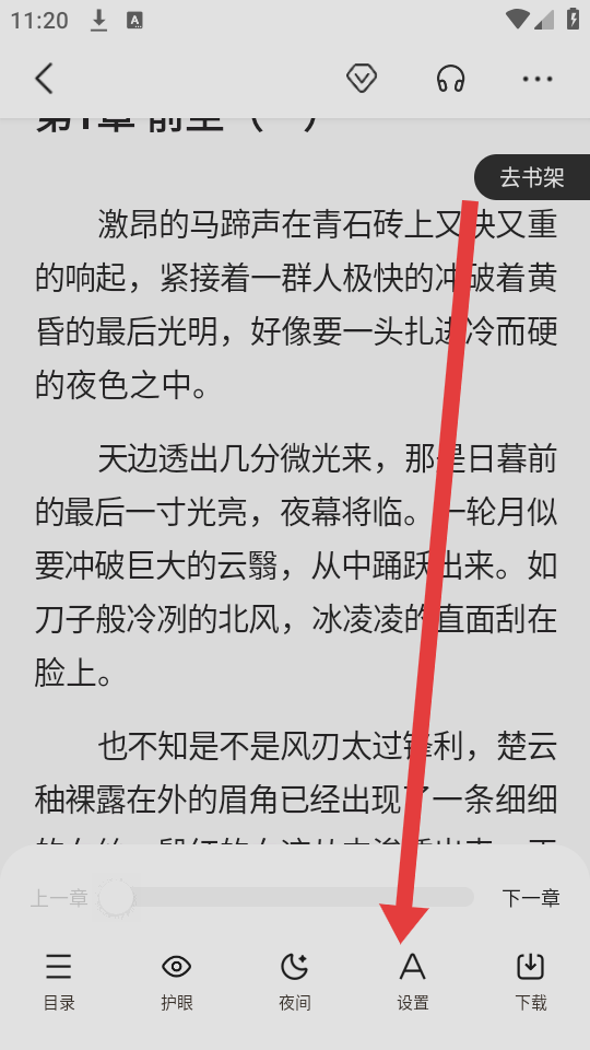 1、进入百度阅读的书籍阅读页,我们需要点击屏幕中间唤出工具栏,选择设置开启设置入口。