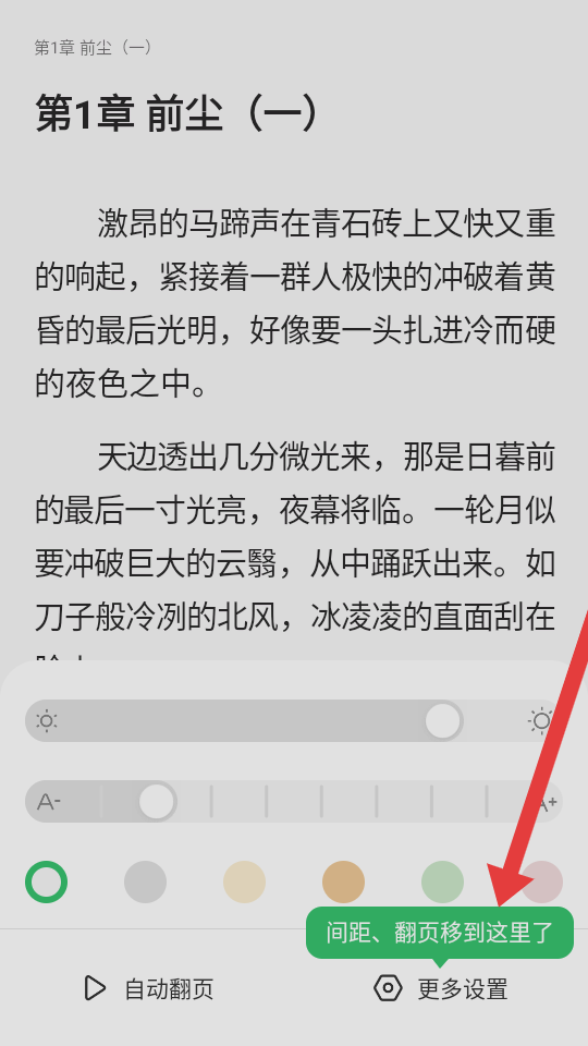 2、在小说设置的界面中,需要继续点击更多的设置,进入包含翻页动画等功能的设置页面。