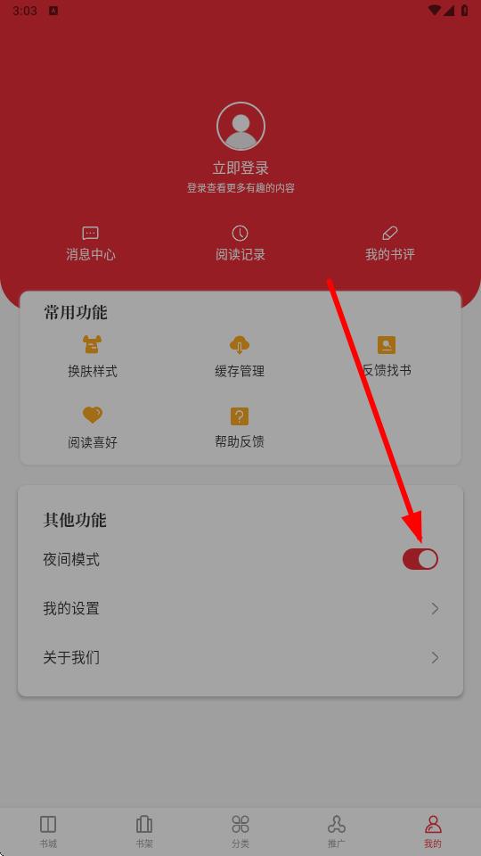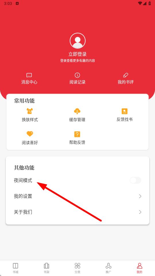 2、在我的页面,找到其他功能板块,点击夜间模式。