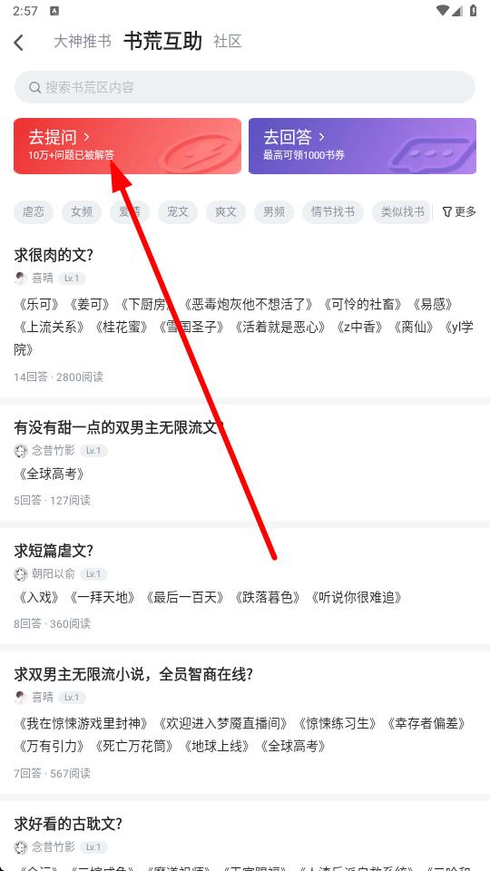 3、在书荒互助界面,点击去提问按钮,若处于游客状态,系统会提示登录,按提示完成登录后,即可进行提问,寻求书荒相关问题的解答。