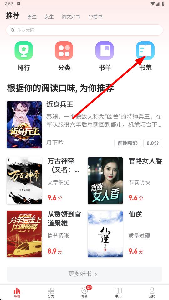 1、打开追书神器APP,进入主界面中的 “书城” 页面,点击上方导航栏里的书荒选项。