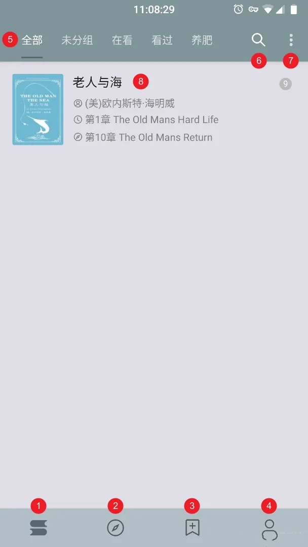 1、进入软件后将会看到各种功能,有书架、发现、订阅、分组、搜索、书籍信息等功能;